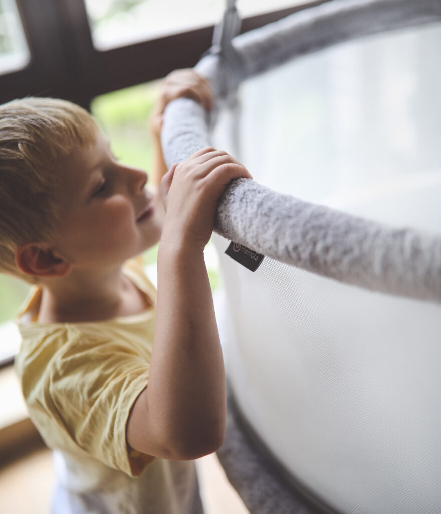 Zasłonka w Memola ogranicza nadmiar bodźców wzrokowych i słuchowych, pomagając dziecku wyciszyć się i spokojnie zasnąć.