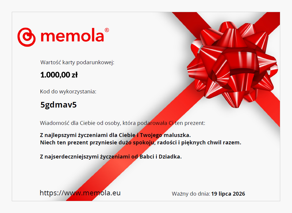 To idealny upominek dla świeżo upieczonych lub przyszłych rodziców. Dzięki kuponowi mogą wybrać dokładnie to, czego najbardziej potrzebują: Memola 3w1, akcesoria lub dodatki wspierające spokojny sen i harmonijny rozwój dziecka.
