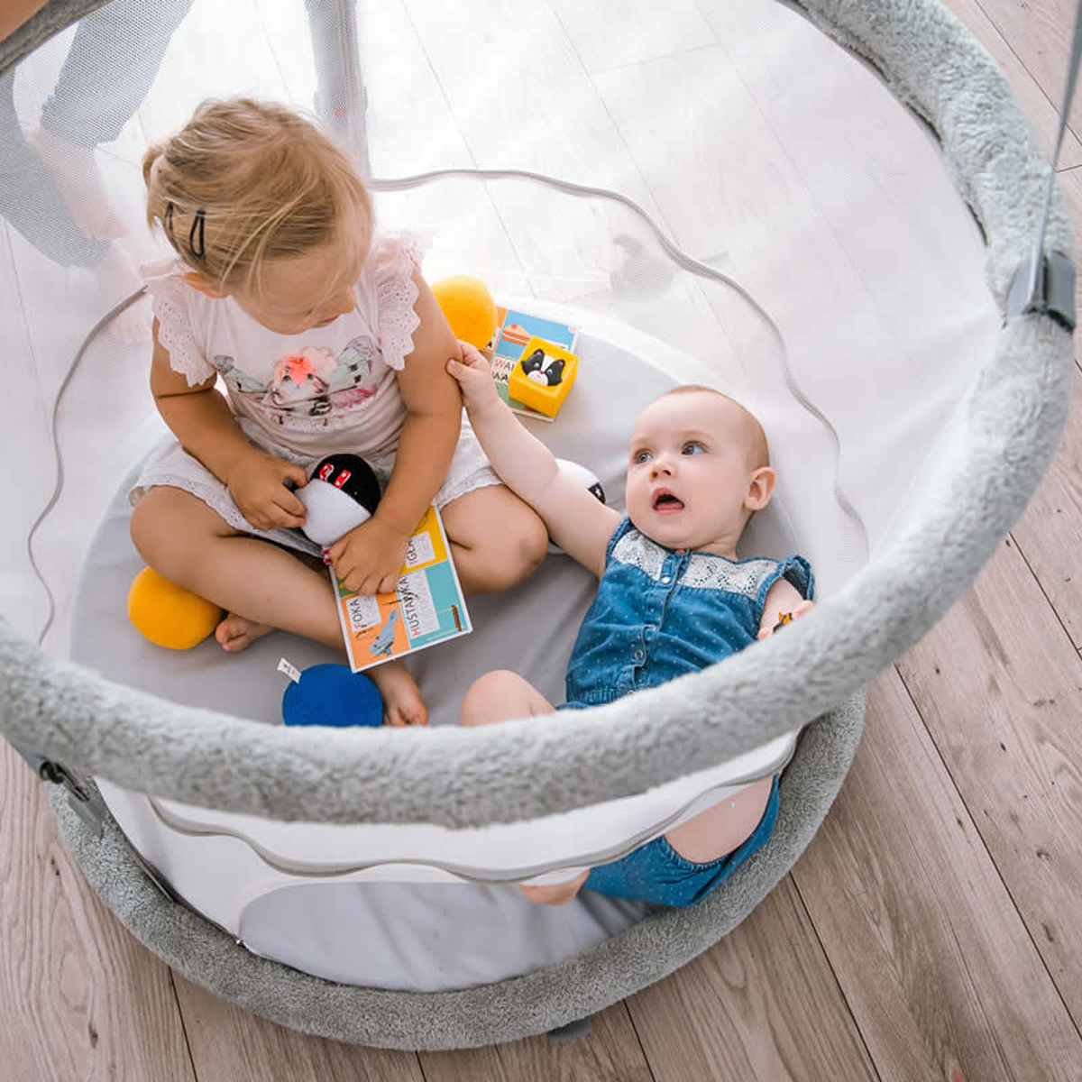 Aby zmienić Memolę w kosz sensoryczny, wystarczy odpiąć zamek i klamry, unieść burtę na wyższy poziom i ponownie ją zabezpieczyć. Regulacja jest prosta i pozwala dopasować wysokość ścianek do aktywności dziecka, zwiększając bezpieczeństwo.